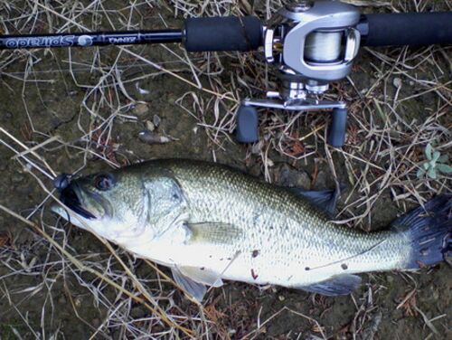こないだペンシル君と行った池に一人で行ってきた。 一匹釣れた。 今年三匹目のバスは43cmだ。 スラヴァーバイブ65を丸呑みした。 写真ではルアー見えないけど、口の中に入ってます。 冬のガリガリバスと違って肉付きがしっかりした、いいバスだ。 で…